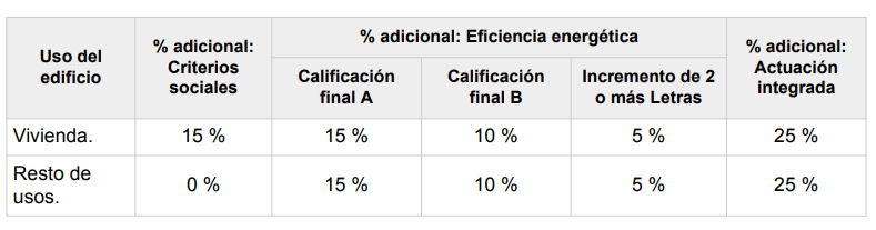 Ayuda Adicional por criterio social, eficiencia energética o actuación integrada. Los valores de la ayuda adicional que corresponden a esta tipología de actuación, se indican en el cuadro siguiente: