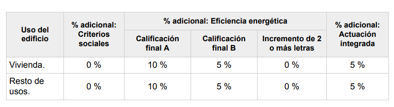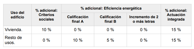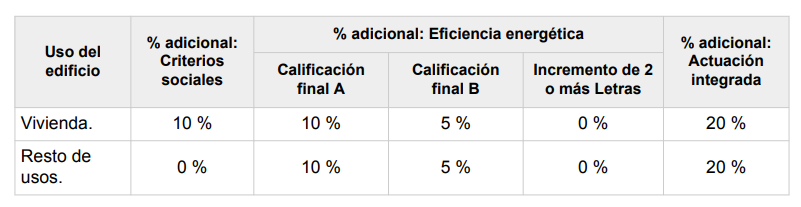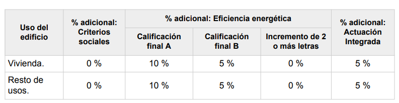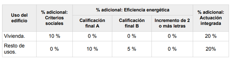 Ayuda Adicional por criterio social, eficiencia energética o actuación integrada. Los valores de la ayuda adicional que corresponden a esta tipología de actuación, se indican en el cuadro siguiente: